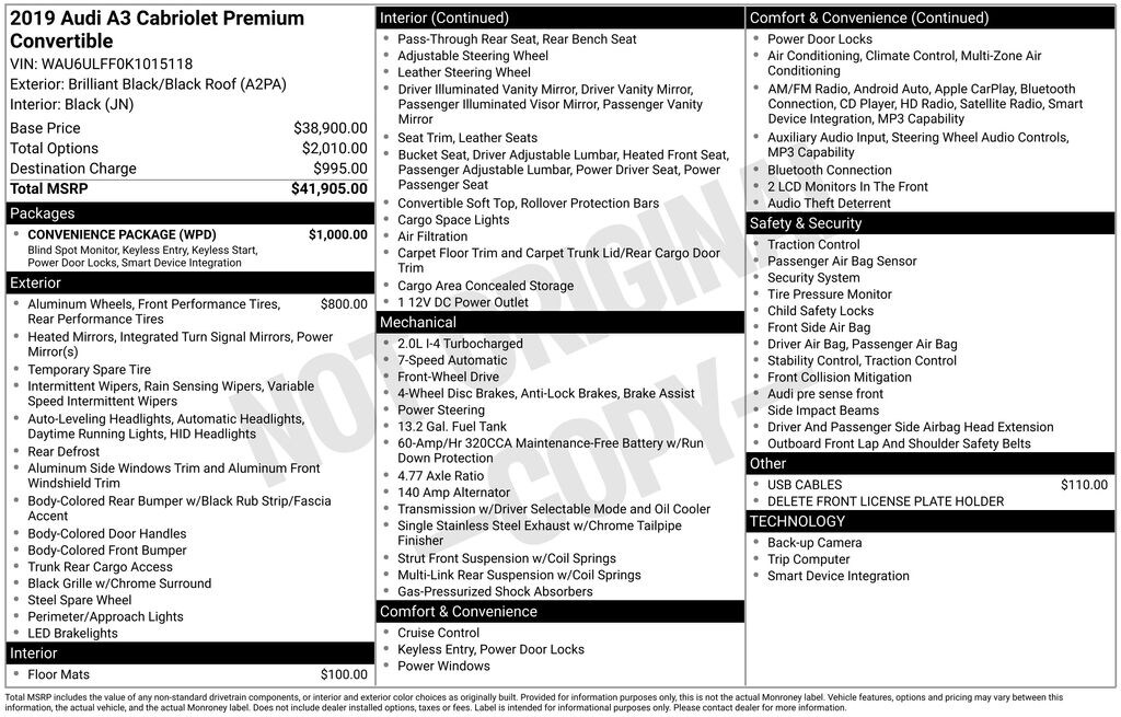 Black 2019 Audi A3 2.0T Premium FrontTrak FrontTrak 7-Speed Automatic S tronic 2.0L 4-Cylinder TFSI ***5-DAY SPECIAL***BUY BEFORE AUCTION***HAS PASSED NC STATE INSPECTION***LAST DAY TO PURCHASE IS 12/24!***CALL TO SET UP AN APPOINTMENT NOW!***, Leather.