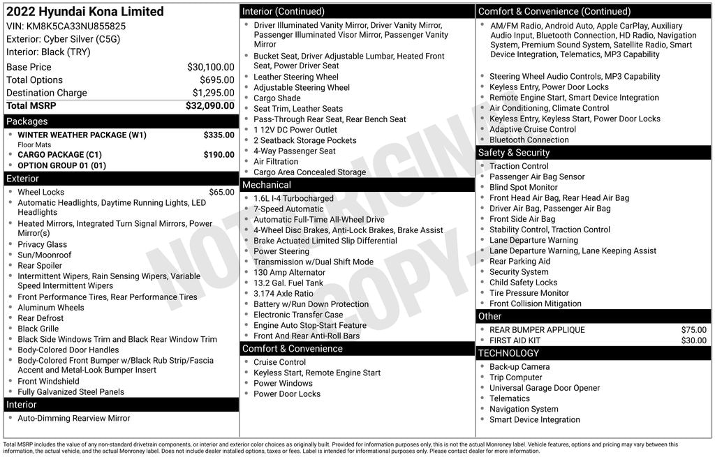 Cyber Silver 2022 Hyundai Kona Limited AWD 7-Speed Automatic 1.6L I4 DGI Turbocharged DOHC 16V LEV3-ULEV70 195hp