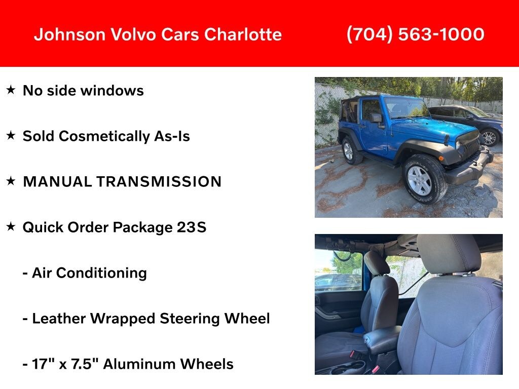 No side windows, Sold Cosmetically As-Is, MANUAL TRANSMISSION, 17" x 7.5" Aluminum Wheels, 8 Speakers, Air Conditioning, Connectivity Group, Electronic Stability Control, Front fog lights, Leather Wrapped Steering Wheel, Quick Order Package 23S, Traction control, Uconnect Voice Command w/Bluetooth, Variably intermittent wipers, Vehicle Information Center.